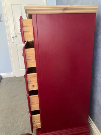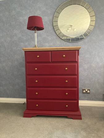 Refinished Pine Chest Of Drawers, Light Pine Top, 6 Drawers, Newly Painted in Burgundy and protected with a Wax Finish. The dimensions are approx; L - 93cm W - 49.5cm H - 115cm